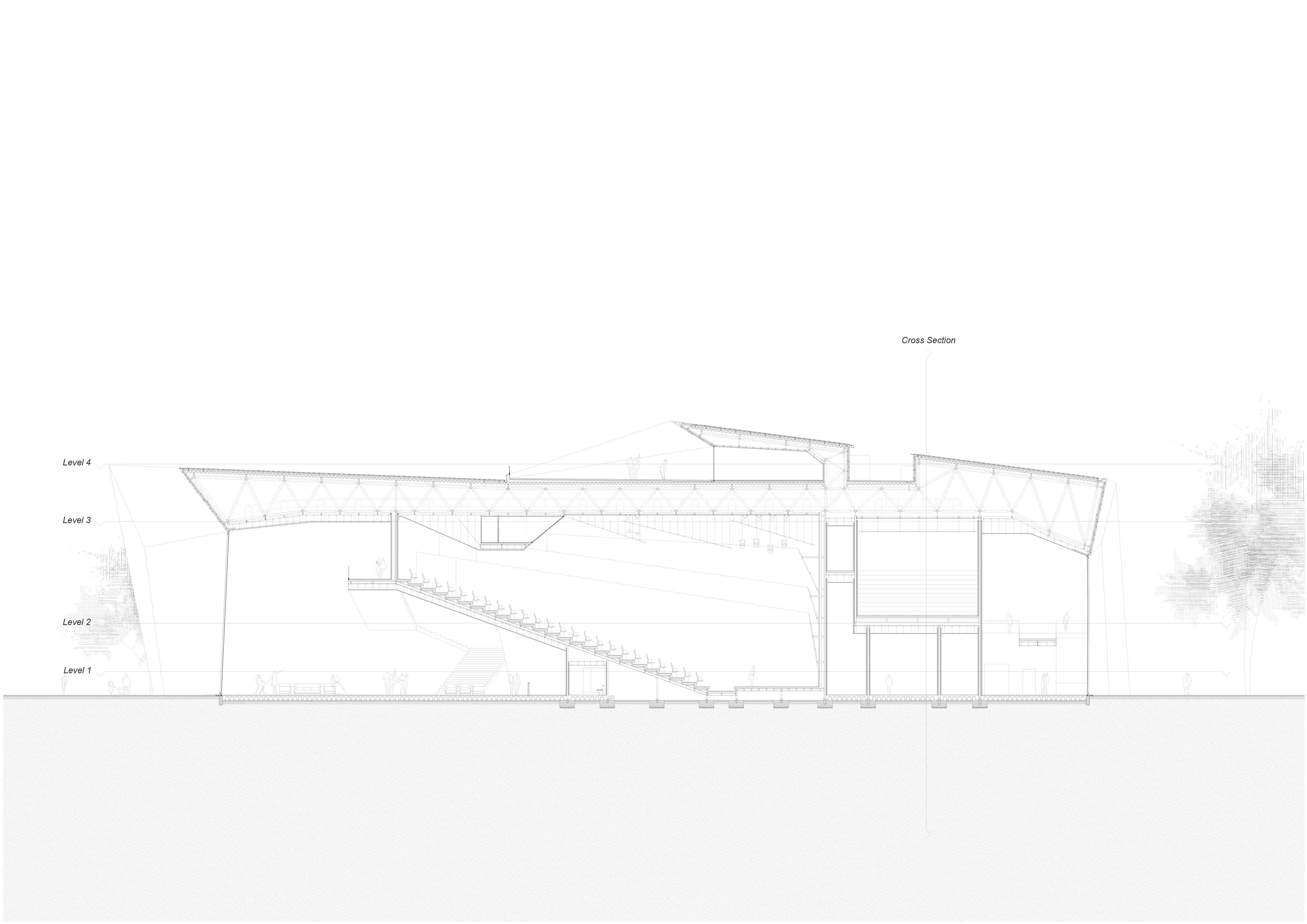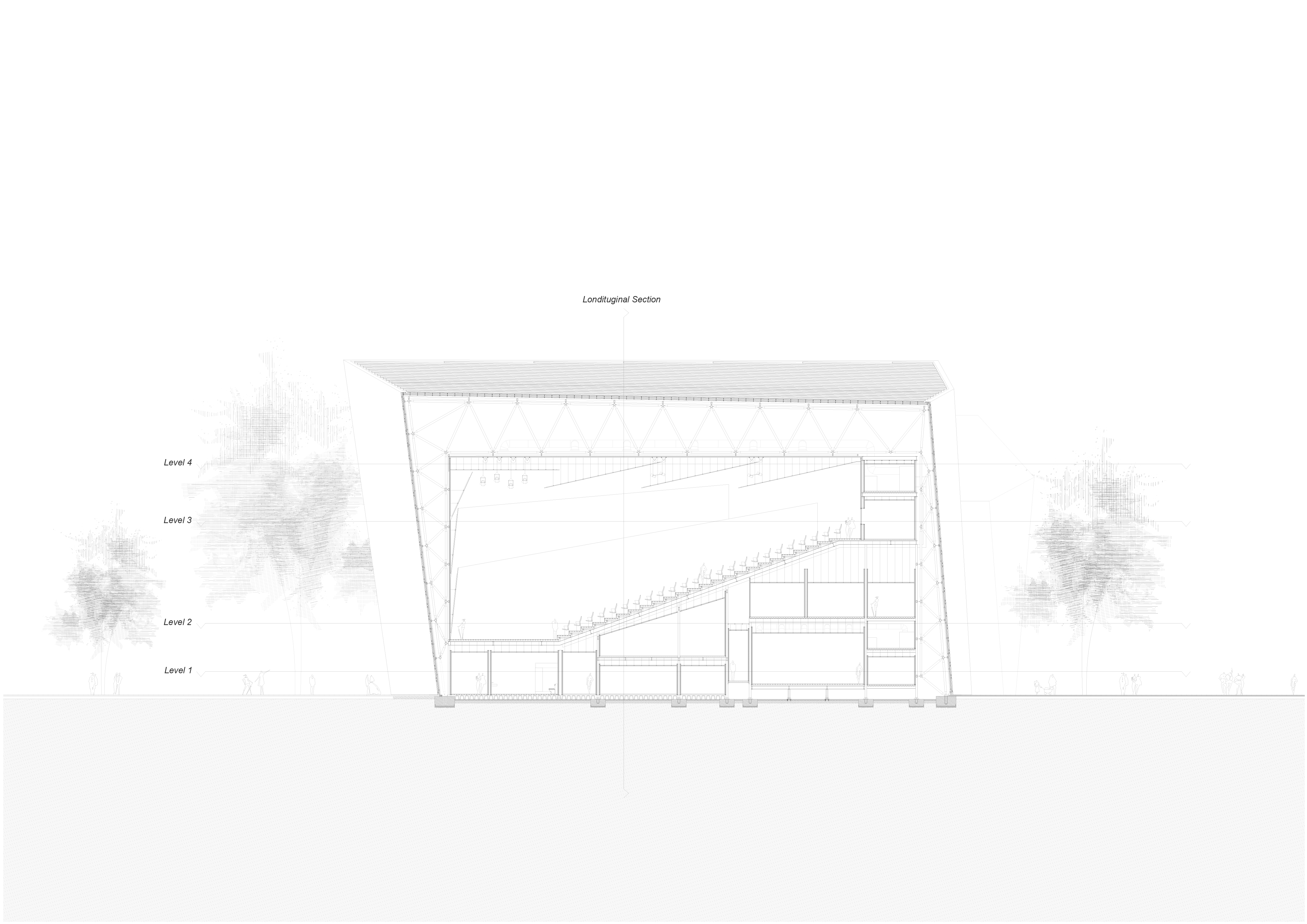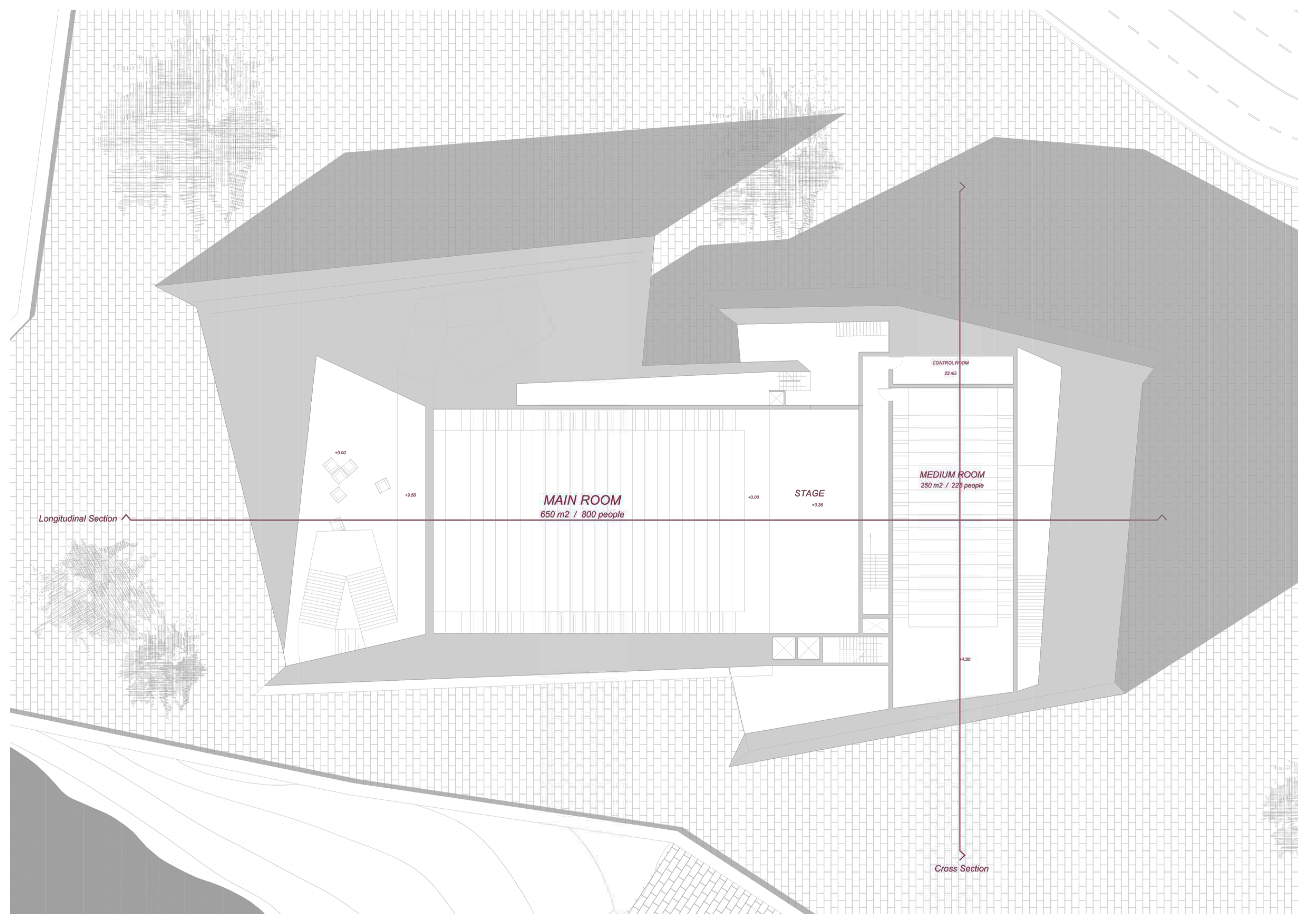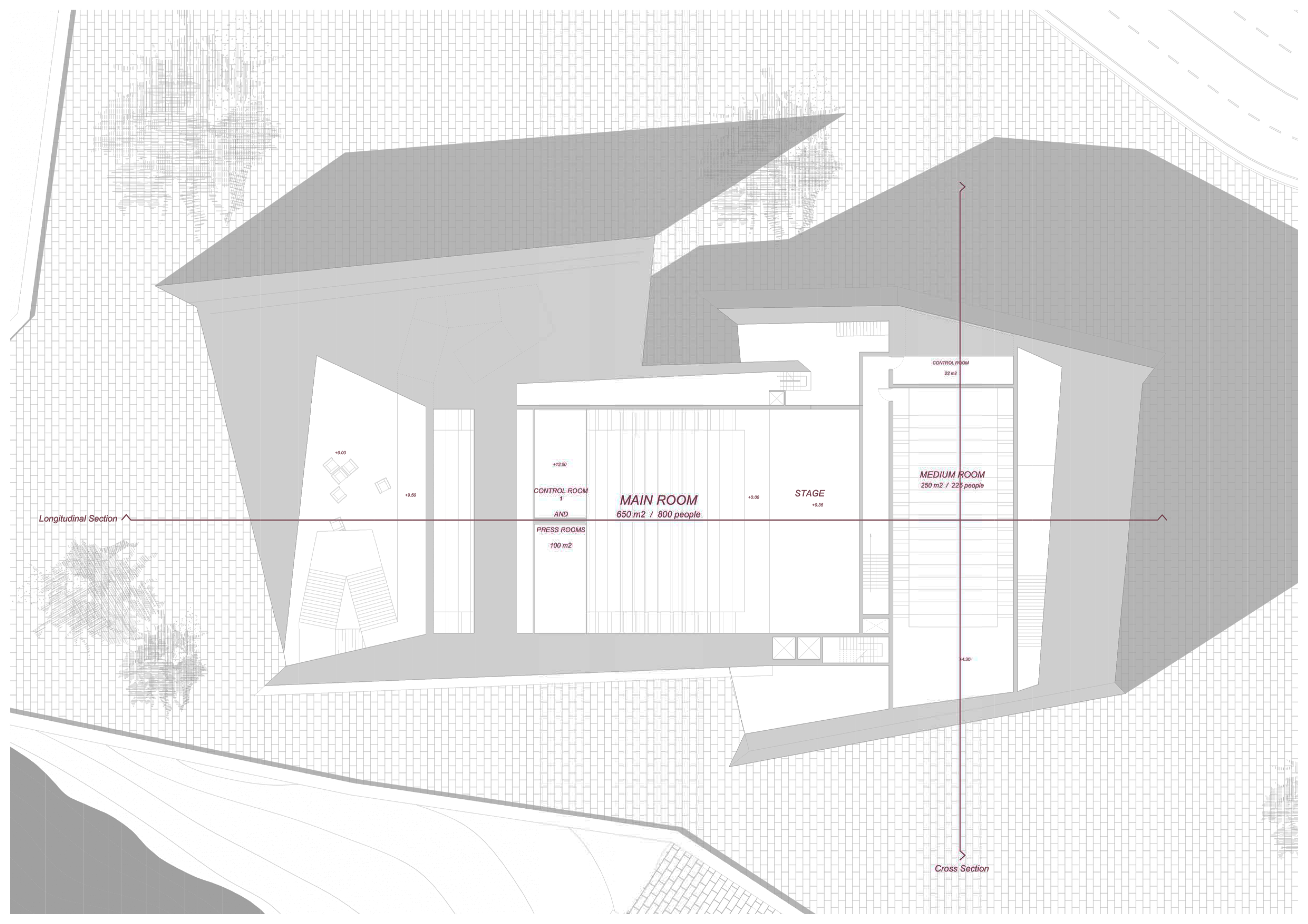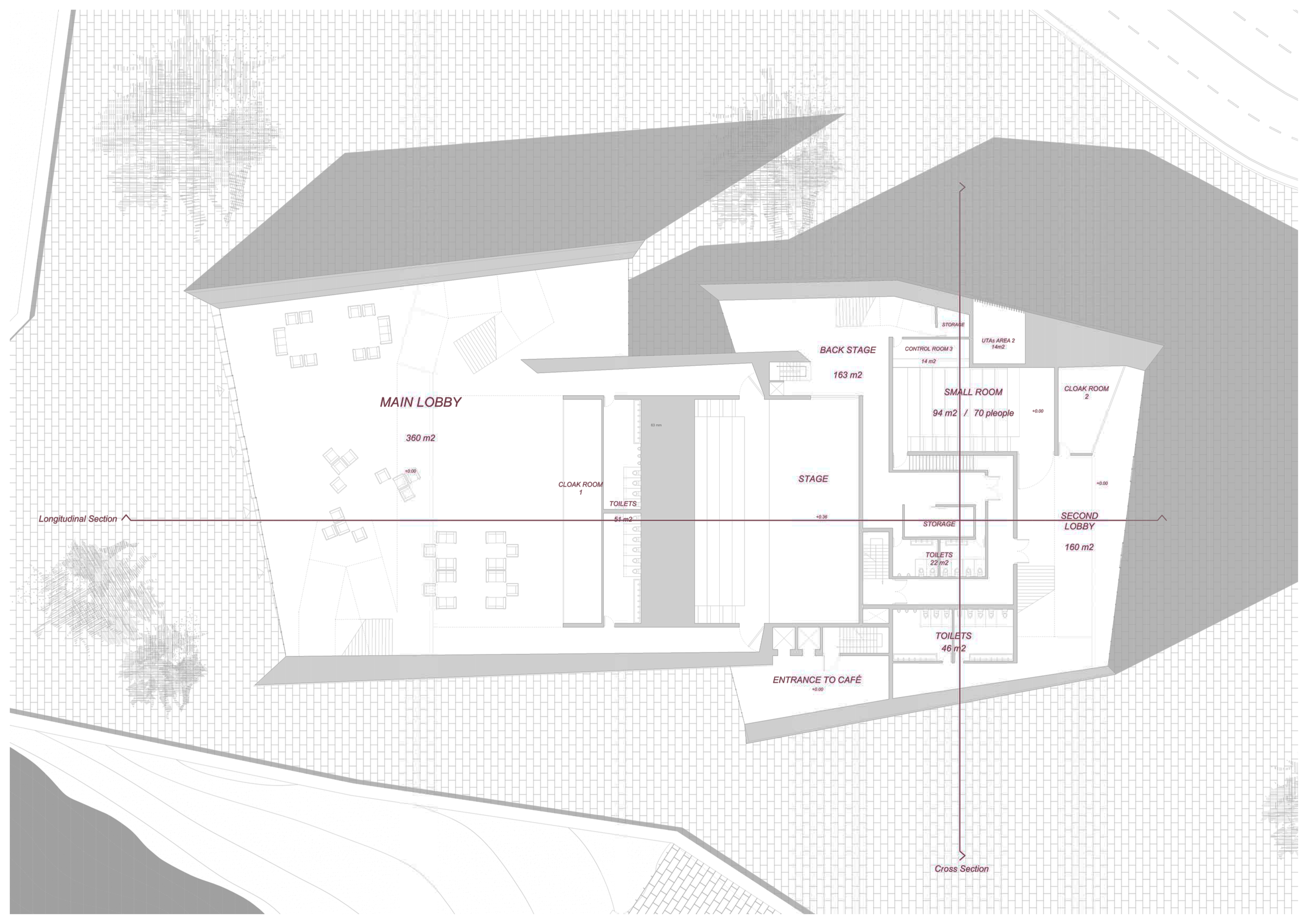 Um diese Bedürfnisse vom Stadt auszufüllen hat der Architekt ein sehr besonderes Objekt entworfen. Als wäre es ein runtergafallene Stein aus der Weltraum liegt das Gebäude an der westliche Spitze der Promenade. Genau wie der damalige düstere Strand (Znjan ) ist der einmal kalte und tot fliegende Felsen jetzt aber lebensvoll. Die Öffnungen im Meteorit werden als Foyers benutzt, die durch den inneren Stollen in die Höhlen einführen. In diesen Höhlen die jetzt als Saalen eingestezt sind, könnten bis zum 800 Leute ein Hans Zimmer Konzert genießen oder eine Diskussion über Neurologie teilnehmen. Der Stein schläft nie, nicht einmal wenn es keine Veranstaltungen gibt. Da den Roof-Top sich als einer der drei besten Orte in Split gefestigt hat, um etwas zu trinken, während der Himmel über die entfernten kroatischen Inseln orange wird.