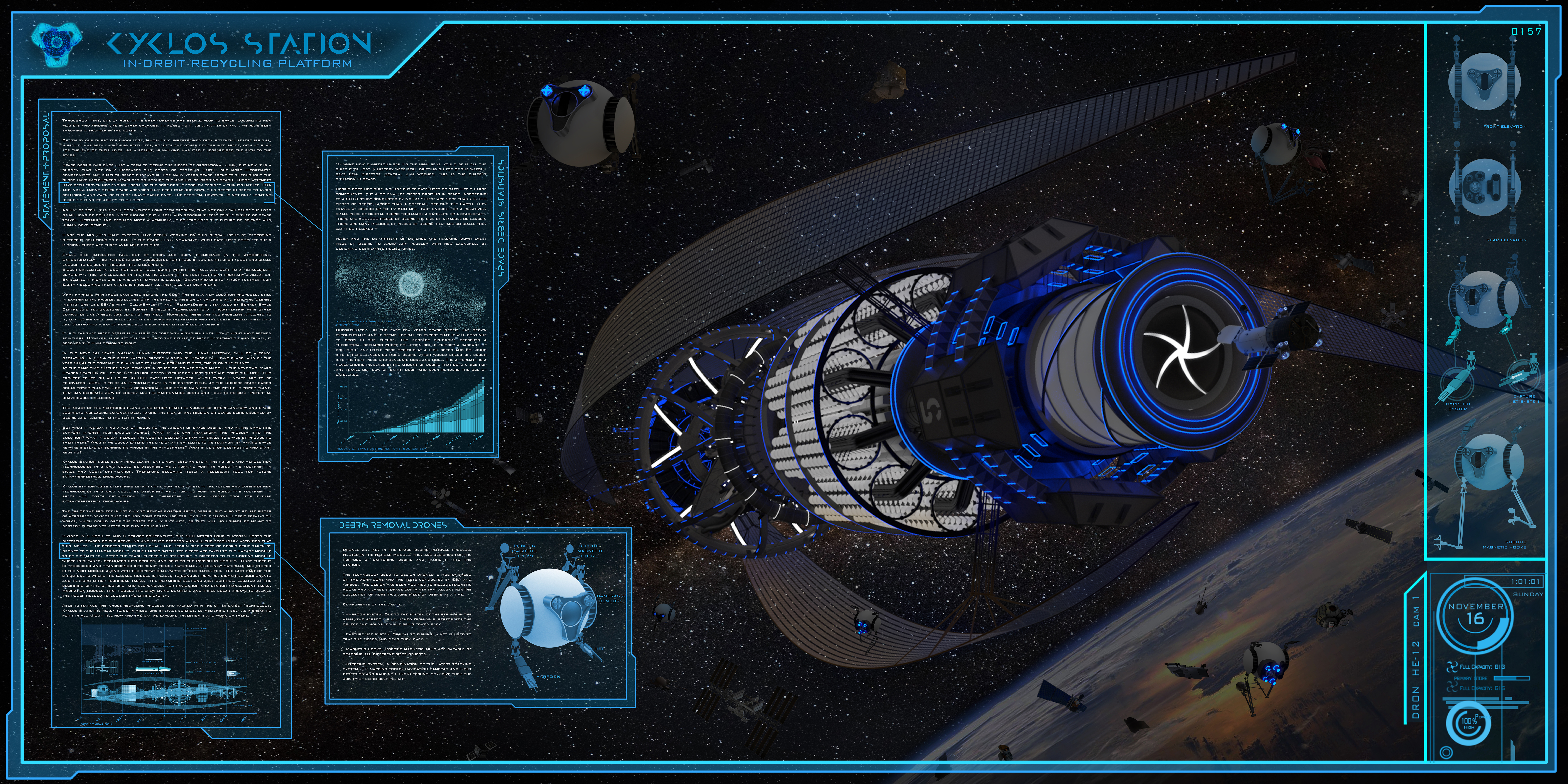 Kyklos Station takes everything learnt until now, sets an eye in the future and combines new technologies into what could be described as a turning point in humanity’s footprint in space and costs optimization. The aim of the project is not only removing the current amount of debris, but at the same time giving old useless pieces of aerospace devices a second chance. By doing so it allows in-orbit reparation works, which would drop the costs of any satellite, as they will no longer be meant to destroy themselves at the end of their life.
