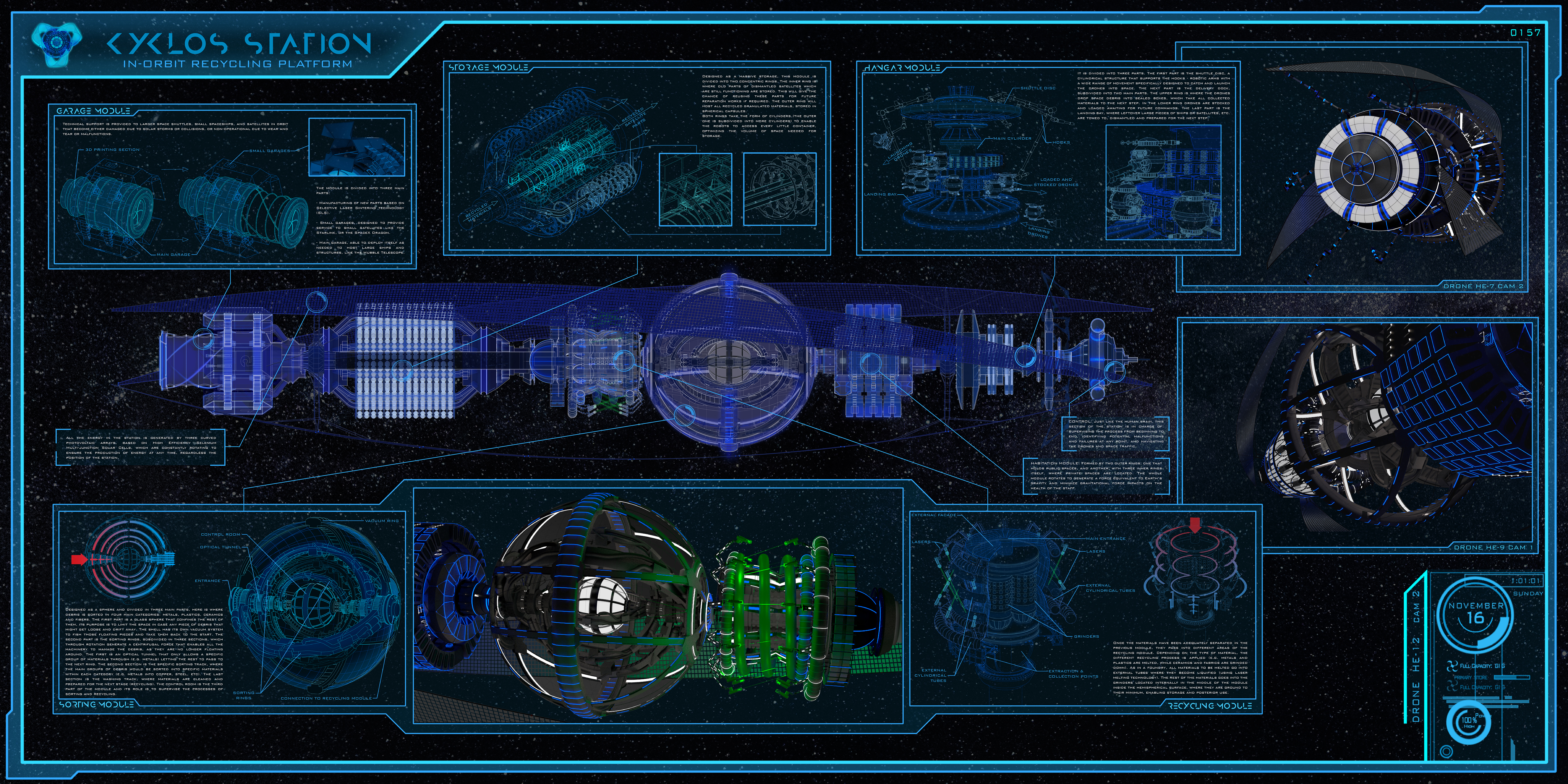 As a well-oiled machine, the 600 meters long building is, on one hand, capable to track down debris and process it into new resources. On the other hand, it is also able to give technical support to any spacecraft. Packed with the utter latest technology, Kyklos Station is ready to establish itself as the key to space exploration and interplanetary traffic, and thus a step forward into a greener and greater future of humanity’s development.
